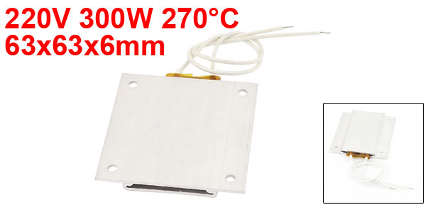 Product Name PTC Heater Material Aluminum Voltage 220V Power 300W Temperature 270 Celsius Size 63x63x6mm / 2.5" x 2.5" x 0.24"(L*W*T) Mount Hole 50x50mm / 2" x 2" Weight 8g Package Content 1 x PTC Heater - Reviews