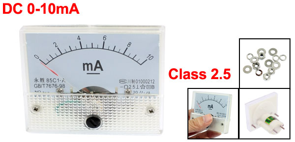 Product Name Analog Ammeter Measuring Current Range DC 0-10mA Accuracy Class 2.5 Meter Face Size(Approx) 64 x 56 x 11mm/ 2.5" x 2.2" x 0.43" (L*W*T) Thread Dia(Approx) 0.28cm / 0.110"