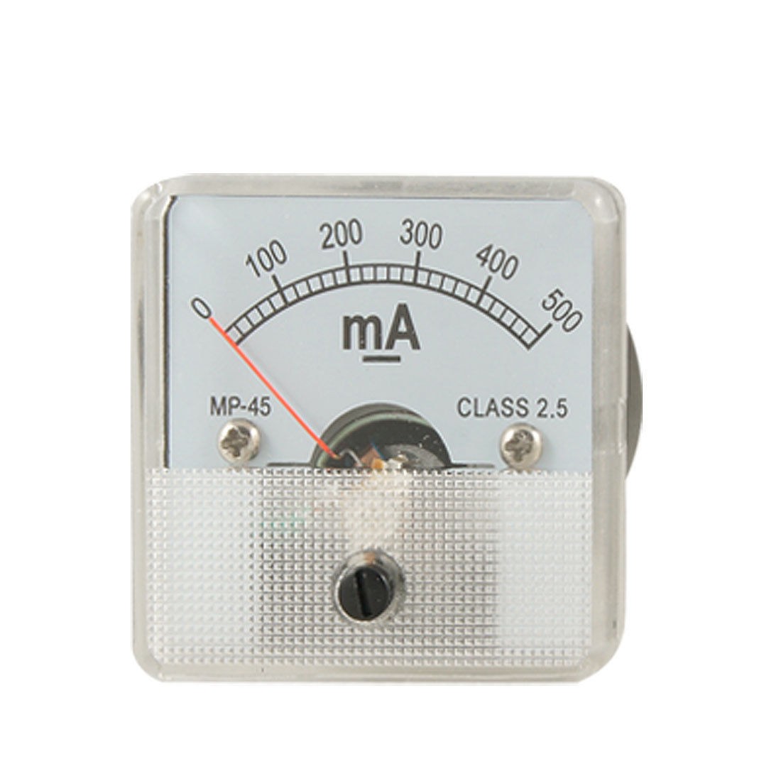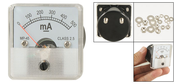 Product Name Analog Ammeter Model No. MP-45 Measuring Current Range DC 0-500mA Accuracy Class 2.5 Meter Face Size(Approx) 4.5 x 4.5 x 1cm / 1.8" x 1.8" x 0.4"(L*W*T) Thread Dia(Approx) 0.38cm / 0.150" 0.28cm / 0.110" Overall Depth 4.5cm / 1.8" Color White Material Metal & Plastic Net Weight 46g Package Content 1 x Analog Ammeter Several Installing Parts - Reviews