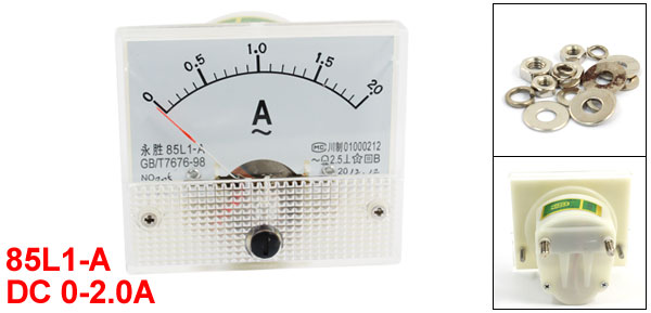 Product Name Analog Ammeter Type 85L1-A Measuring Current Range DC 0-2.0A Accuracy 2.5 Panel Size(Approx) 64 x 56 x 9mm / 2.5" x 2.2" x 0.35"(L*W*T) Thread Size Big One: 3.8 x 9mm / 0.15" x 0.35"(D*L)