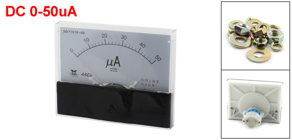 Product Name Analog Ammeter Measuring Current Range DC 0-50uA Accuracy 1.5 Panel Size(Approx) 10 x 8 x 1.2cm / 3.9" x 3.1" x 0.5" (L*W*H) Thread Size Big One: 4 x 11mm / 0.16" x 0.43"(D*L)