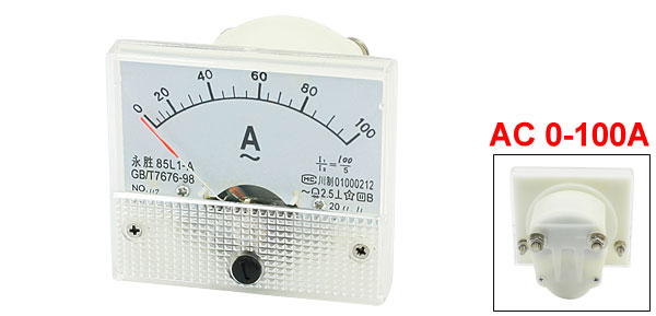 Product Name Analog Ammeter Model 85L1-A Measuring Current Range AC 0-100A Accuracy Class 2.5 Meter Face Size(Approx.) 6.4 x 5.6 x 1cm / 2.5" x 2.2" x 0.4" (L*W*H) Total Thickness 5.7cm / 2.2" Mounting Thread Dia. 4mm/ 0.16", 3mm/ 0.12" Material Plastic, Electronic Components Main Color White, Beige Weight 110g Package Content 1 x Analog Ammeter