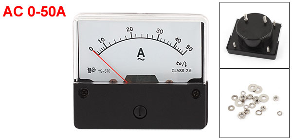 Product Name Analog Ammeter Model YS-670 Measuring Current Range AC 0-50A Accuracy Class 2.5 Meter Face Size(Approx.) 7x 6 x 1cm / 2.8" x 2.4" x 0.4" (L*W*H) Total Thickness 3.5cm / 1.4" Mounting Thread Dia. 4mm/ 0.16", 3mm/ 0.12" Material Plastic, Electronic Components Main Color White, Black Weight 70g Package Content 1 x Analog Ammeter
