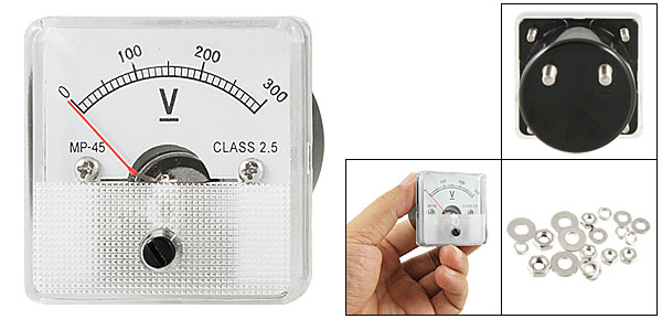 Product Name Analog Voltmeter Model No. MP-45 Measuring Voltage Range DC 0-300V Accuracy Class 2.5 Meter Face Size(Approx) 4.5 x 4.5 x 1cm / 1.8" x 1.8" x 0.4"(L*W*T) Thread Dia(Approx) 0.38cm / 0.150" 0.28cm / 0.110" Overall Depth 4.5cm / 1.8" Color White Material Metal & Plastic Net Weight 48g Package Content 1 x Analog Voltmeter Several Installing Parts - Reviews