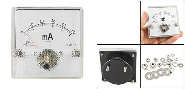DC Current Panel Meter Model No. YS-80 Scale Range DC 0~50mA Accuracy Class 2.5 Back Screw Diameter 5mm/ 0.2" & 3mm/ 0.12" Back Round Base Dia. 64mm/ 2.5" Panel Size 8 x 8 x 1.3cm/ 3.1" x 3.1" x 0.5" (L*W*T) Overall Depth 4.8cm/ 1.9" Color White & Black Main Material Plastic & Metal Net Weight 103g Package 1 x DC Current Panel Meter - Reviews