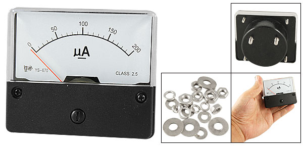 Product Name Analog Ammeter Measuring Current Range DC 0 - 200uA Accuracy Class 2.5 Meter Face Size(Approx) 7 x 6cm/ 2.7" x 2.3" (L*W) Thread Size 0.28 x 0.75cm / 0.11" x 0.30" (D*L) 0.38 x 0.8cm / 0.15" x 0.3" (D*L) Overall Depth 4.3cm/ 1.7" Color White, Black Net Weight 69g Package Content 1 x Analog Ammeter Fitting Part - Reviews