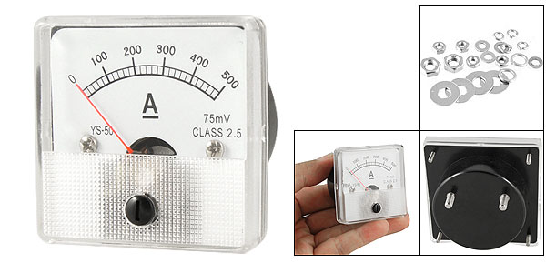 DC Current Panel Meter Model No. YS-50 Scale Range DC 0~500A Accuracy Class 2.5 Back Screw Diameter 4mm/ 0.16" & 3mm/ 0.12" Back Round Base Dia. 45mm/ 1 3/4" Panel Size 5 x 5 x 1.1cm/ 2" x 2" x 0.4" (L*W*T) Overall Depth 4.3cm/ 1.7" Color White & Black Main Material Plastic & Metal Net Weight 58g Package 1 x DC Current Panel Meter - Reviews
