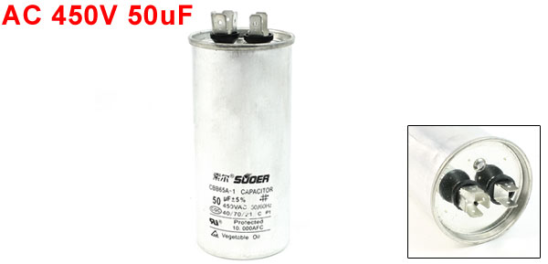 Product Name Motor Capacitor Material Polypropylene Film Model CBB65A-1 Type Anti-Explosion Capacitance 50uF Tolerance ±5% Rated Voltage AC 450V Frequency 50/ 60Hz Temperature Coefficient 40/70/21 Body Dimension 11 x 5cm/ 4.3" x 2"(H*D) Total Length 12cm/ 4.7" Color Silver Tone Weight 218g Package Content 1 x Motor Capacitor - Reviews