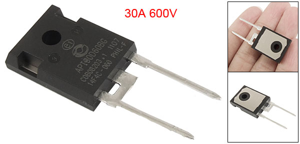 Product Name Rectifier Diode Model No. APT30D60BG Vr 600V Current Rating 30A Mounting Hole Diameter 3mm / 0.118" Pin Size 21 x 9.5mm / 0.83" x 0.37" ( L* Pitch) Total Size 41 x 16 x 5mm / 1.6" x 0.63" x 0.2" (L*W*H) Weight 6.6g Package Content 1 x Rectifier Diode - Reviews