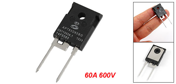 Product Name Rectifier Diode Model No. APT60D60BG Current 60A Reverse Voltage 600V Pin Length 20mm/0.78" Hole Diameter 3.5mm/0.14" Body Dimension 20 x 15 x 5mm/0.78" x 0.59" x 0.2"(L*W*T) Net Weight 7g Package Content 1 x Rectifier Diode - Reviews