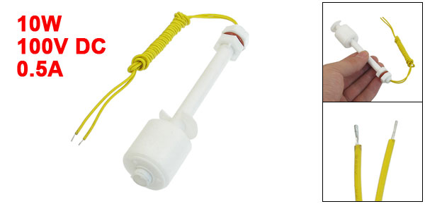 Product Name Float Switch Max Contact Rating 10W Max Switching Voltage 100V DC Max Switching Current 0.5A Max Breakdown Voltage 220V DC Max Carry Current 1.0A Max Contact Resistance 100mΩ Temperature Rating -10 ~ +60 °C / +85 °C Float Ball Material PP Float Body Material PP Float Ball Size(Approx) 22 x 24mm / 0.86" x 0.94"(L*D) Thread Dia(Approx) 9mm / 0.31" Hex Nut Diameter 14mm / 0.55" Bottom Clip Dia(Approx) 20mm / 0.8" Body Total Length 115mm / 4.5" Cable Length 36cm / 14" Color White, Yellow Weight 17g Package Content 1 x Float Switch - Reviews