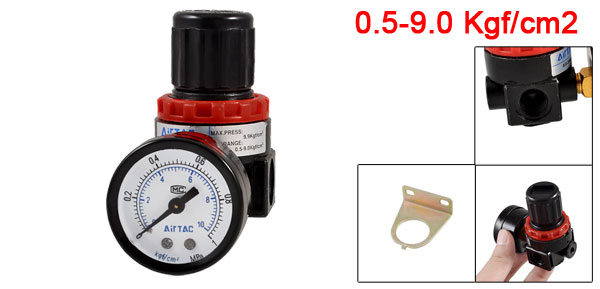 DetailsAR-2000 Air Source Compressor Pneumatic Regulator w Pressure Gauge  Product Name Pneumatic Regulator Material Metal, Plastic Working Medium Air Max. Pressure 9.9 Kgf/cm2 Adjustable Pressure Range 0.5-9.0 Kgf/cm2 Joint Pipe Bore Dia 12 mm / 15/64" Pressure Gauge Connector Dia 9.8 mm / 0.39" Pressure Gauge Range 0-10 Kgf/cm2, 0-1 MPa Total Size 4 x 4 x 7.2 cm / 1.57" x 1.57" x 2.8" (L*W*H) Pressure Gauge Size 4.1 x 2.3cm / 1.6" x 0.9" (D*T) Color Black, Red Weight 156g Package Content 1 x Pneumatic Regulator 1 x Pressure Gauge 1 x Install Bracket