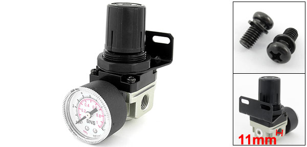Product Name Pneumatic Regulator Model AR2000-02 Working Medium Air Max. Pressure 9.9Kgf/cm2 Adjustable Pressure Range 0.05-0.85Mpa Joint Pipe Bore Diameter 11mm Joint Pipe Bore Size 1/4" Pressure Gauge Connector Dia 8.5mm/ 0.33" Pressure Gauge Range 0-10 Kgf/cm2, 0-1 MPa Total Size 8.5 x 5.5 x 9 cm/ 3.3" x 2.2" x 3.5" (L*W*H) Pressure Gauge Size 4 x 3.5cm/ 1.6" x 1.4" (D*T) Bracket Mount Hole Size 15 x 5mm/ 0.6" x 0.2"(L*W) Material Metal, Plastic Color Black, Gray Net Weight 243g Package Content 1 x Pneumatic Regulator