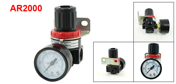 Product Name Pneumatic Regulator Model AR2000 Material Metal, Plastic Working Medium Air Max. Pressure 9.9Kgf/cm2 Adjustable Pressure Range 0.5-0.9Kgf/cm2 Joint Pipe Bore Diameter 13mm Joint Pipe Bore Size 1/4"PT Pressure Gauge Connector Dia 10mm/ 0.39" Pressure Gauge Range 0-10 Kgf/cm2, 0-1 MPa Total Size 8.5 x 7.5 x 5 cm/ 3.4" x 3" x 2" (L*H*W) Pressure Gauge Size 4.1 x 2.5cm/ 1.6" x 0.98" (D*T) Bracket Mount Hole Size 8.4 x 6.5mm/ 0.33" x 0.25"(L*W) Color Black, Silver Tone, Red, Silver Tone Weight 188g Package Content 1 x Pneumatic Regulator