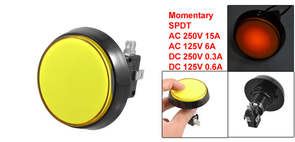 SPDT(1NO 1NC) Rating Voltage & Current AC 250V 15A; AC 125V 6A; DC 250V 0.3A; DC 125V 0.6A Button Pin Number 2 Mounting Hole Diameter 24mm / 0.94" Pin Spacing Distance 19mm / 0.75" Button Head Diameter 52mm / 2.05" Total Size 60 x 65mm / 2.3'' x 2.5''(Max.D*H) Light Color Yellow External Material Plastic, Metal Color Yellow, Black Net Weight 50g Package Content 1 x Arcade Game Illuminated Push Button w Micro Switch - Reviews