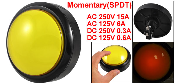 DetailsArcade Game 80mm Yellow Illuminated Momentary Push Button SPDT Micro Switch  Product Name Arcade Game Illuminated Push Button w Micro Switch Action Type Momentary Contact Type SPDT(1NO 1NC) Rating Voltage & Current AC 250V 15A; AC 125V 6A; DC 250V 0.3A; DC 125V 0.6A Button Pin Number 2 Mounting Hole Diameter 24mm / 0.94" Pin Spacing Distance 19mm / 0.75" Button Head Diameter 80mm / 3.1" Total Size 95 x 90mm / 3.7'' x 3.5''(Max.D*H) Light Color Yellow External Material Plastic, Metal Color Yellow, Black Net Weight 159g Package Content 1 x Arcade Game Illuminated Push Button w Micro Switch