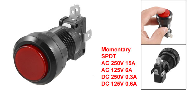 SPDT(1NO 1NC) Rating Voltage & Current AC 250V 15A; AC 125V 6A; DC 250V 0.3A; DC 125V 0.6A Button Pin Number 2 Mounting Hole Diameter 24mm / 0.94" Pin Spacing Distance 19mm / 0.75" Button Head Diameter 24mm / 0.94" Total Size 33 x 65mm / 1.3'' x 2.5''(Max.D*H) Light Color Red External Material Plastic, Metal Color Red, Black Net Weight 28g Package Content 1 x Arcade Game Illuminated Push Button w Micro Switch - Reviews