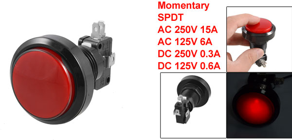 SPDT(1NO 1NC) Rating Voltage & Current AC 250V 15A; AC 125V 6A; DC 250V 0.3A; DC 125V 0.6A Button Pin Number 2 Mounting Hole Diameter 24mm / 0.94" Pin Spacing Distance 19mm / 0.75" Button Head Diameter 36mm / 0.94" Total Size 45 x 65mm / 1.8'' x 2.5''(Max.D*H) Light Color Red External Material Plastic, Metal Color Red, Black Net Weight 36g Package Content 1 x Arcade Game Illuminated Push Button w Micro Switch - Reviews