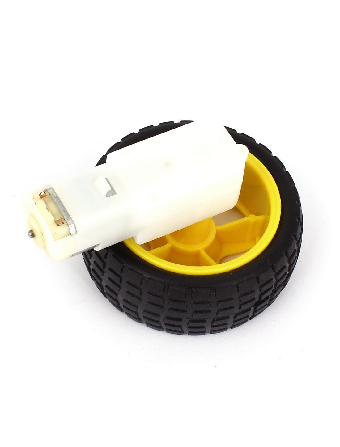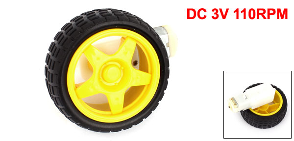 DetailsArduino Smart Car Robot Plastic Tire Wheel with DC 3V 110RPM Gear Motor  Main Color Black, Yellow Net Weight 68g Wheel Size 6.5 x 2.6cm/2.6" x 1"(D*H) Country of Manufacture CHINA Package Content 1 Pcs x RC Toy Wheel 1 Pcs x Gear Motor Material Plastic, Rubber Motor Size 6.2 x 2.1cm/2.4" x 0.8"(L*W) Motor Rating 3V 110RPM