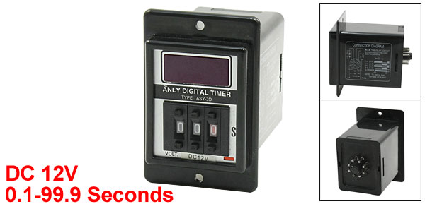Product Name Digital Time Relay Type ASY-3D Control Voltage DC 12V Frequency 50/60 Hz Contact AC 220V 5A Non-inductive Load Time Range 0.1-99.9 Seconds Mount Size (Approx.) 60 x 48 x 68mm/ 2.36" x 1.89" x 2.68" (L*W*Depth) Front Face Size 8.5 x 5.7cm / 3.3" x 2.2"(L*W) Mount Hole Diameter 4.5mm/ 0.18" Total Length 8.8cm / 3.5" Main Color Beige Net Weight 177g Package Content 1 x Digital Time Relay - Reviews