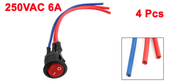DetailsAuto Car 250VAC 10A SPST Red Light Indicator ON/OFF Rocker Switch 4 Pcs  Item Name Car Rocker Switch Type On / Off (SPST) Voltage & Current 250VAC 6A LED Indicator Light Color Red Switch Size 2.3 x 2.3cm/0.9" x 0.9"(L*D) Mount Dia 20mm/0.78" Cable Length 13cm/5.1" Color Black, Blue, Red Material Plastic, Electronic Parts Weight 40g Package Content 4 x Car Rocker Switch