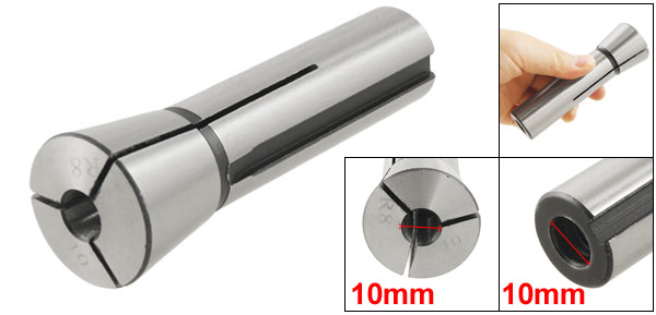 Product Name Spring Collet Model R8-B10 Shank Diameter 24mm / 0.94" Clamping Diameter 3mm / 0.11" Thread Dia 10mm/0.39" Overall Size 32 x 106mm/ 1.25" x 4.1" (Max.D*L) Material Stainless Steel Color Silver Tone Net Weight 325g Package Content 1 x Spring Collet - Reviews