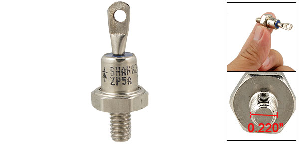 Product Name Rectifier Diode Model ZP5A Average Forward Current 5A Repetitive Peak Reverse Voltage 100-5000V Repetitive Peak Reverse Current <=2mA Peak Forward Voltage <=1.6V Surge Current 7.9A Thread Dia(Approx) 0.56cm / 0.220" Overall Size(Approx) 1.3 x 1.3 x 3.7cm / 0.5" x 0.5" x 1.5"(L*W*H) Material Metal Color Silver Tone Net Weight 9g Package Content 1 x Rectifier Diode  - Reviews
