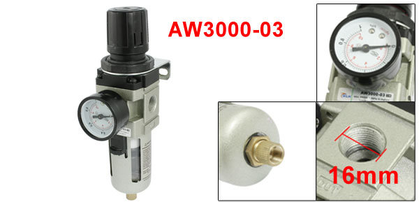 Product Name Pneumatic Regulator Model AW3000-03 Material Metal, Plastic Working Medium Air Max. Pressure 1.0MPa / 10.2kgf/cm2 Adjustable Pressure Range 0.15-0.85Mpa / 20-120psi / 1.5-8.5Bar Joint Pipe Thread Diameter 16mm Joint Pipe Size 3/8 PT Gauge Connector Thread Diameter 9.5mm Gauge Range 0-1.0MPa / 0-10.2kgfc/m2 Total Size 53 x 203mm/ 2" x 8" (D * H) Pressure Gauge Size 42 x 24mm/ 1.6" x 0.94" (D * T) Color Black, Gray Weight 538g Package Content 1 x Pneumatic Regulator 1 x Pressure Gauge 1 x Install Bracket - Reviews