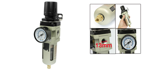 Product Name Air Source Treatment Model AW3000-03 Material Metal, Plastic Working Medium Air Max. Pressure 1.0Mpa (10kgf/cm2) Set Pressure 0.05-0.85Mpa (0.51-8.7kgf/cm2) Joint Pipe Bore 13mm/ 0.51" Pressure Gauge Thread Dia 9.5mm/ 0.37" Pressure Gauge Range 0-1Mpa (0-10kgf/cm2) Max. Temperature 60 Degree Total Size 20.5 x 5.5 x 5.3cm / 8.1" x 2.2" x 2.1" (L*W*T) Pressure Gauge Size 4 x 2.2cm/ 1.6" x 0.87" (D*T) Color Black, Gray Weight 586g Package Content 1 x Air Source Treatment