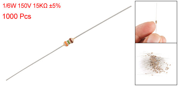 Product Name Carbon Film Resistors Rating Power 1/6W Resistance 15K Ohm Resistance Tolerance ± 5% Withstand Voltage 150V Size(Not Include Leads) 0.3 x 0.17cm / 0.118" x 0.067"(L*D) Leads Dia(Approx) 0.03cm / 0.012" Overall Length(Approx) 4.55cm / 1.8" Color See the Picture Weight 56g Package Content 1000(±2%) Pcs of Carbon Film Resistors - Reviews