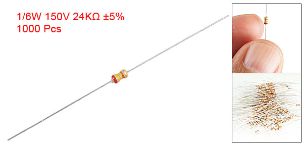 DetailsAxial Carbon Film Resistor 24K Ohm 1/6W Watt 5% 1000 Pcs  Product Name Carbon Film Resistors Rating Power 1/6W Resistance 24K Ohm Resistance Tolerance ± 5% Withstand Voltage 150V Size(Not Include Leads) 0.18 x 0.35cm / 0.07" x 0.14"(D*L) Leads Dia(Approx) 0.03cm / 0.012" Overall Length(Approx) 4.8cm / 1.9" Color As Picture Shown Weight 56g Package Content 1000(±2%) Pcs of Carbon Film Resistors