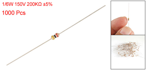 Product Name Carbon Film Resistors Rating Power 1/6W Resistance 200K Ohm Resistance Tolerance ± 5% Withstand Voltage 150V Size(Not Include Leads) 0.36 x 0.17cm / 0.142" x 0.067"(L*D) Leads Dia(Approx) 0.03cm / 0.012" Overall Length(Approx) 4.55cm / 1.8" Color See the Picture Weight 56g Package Content 1000(±2%) Pcs of Carbon Film Resistors - Reviews