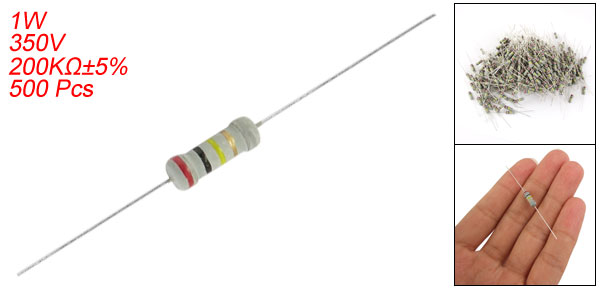 DetailsAxial Carbon Film Resistors 200K Ohms OHM 1W 5% 500 Pcs  Product Name Carbon Film Resistors Material Type Carbon Film Rated Power 1W Resistance Value 200K ohm Tolerance ±5% Withstand Voltage 350V Total Size 57.1 x 3.6mm / 2.248" x 0.142" (L * D) Lead Diameter 0.4mm / 0.0157" Color As Picture Shown Weight 199g Package Content 500 Pcs (± 2%) x Carbon Film Resistors