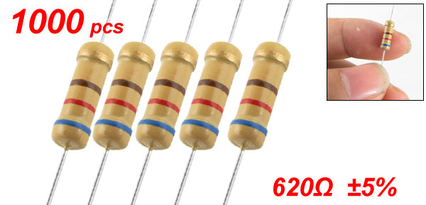 Product Name Carbon Film Resistor Material Type Carbon Film Rated Power 1W Resistance Value 620Ω Tolerance ±5% Body Size (Each One) 10.5 x 3.5mm / 0.41" x 0.138" (L*D) Lead Size (Each End) 24 x 0.3mm / 0.94" x 0.012" (L*D) Total Length (Approx.) 58mm / 2.28" Color As Picture Shown Net Weight 329g Package Content 1000 Pcs (± 2%) x Carbon Film Resistors - Reviews
