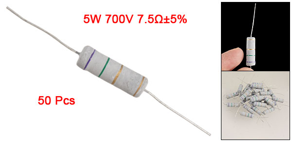 Product Name Metal Oxide Film Resistors Quantity 50Pcs ± 2% Power Rating 5W Resistance Tolerance ± 5% Withstand Voltage 700V Resistance 7.5 Ohm Middle Size (Lead not included) 2.4 x 0.6cm/ 0.9" x 0.2" (L*D) Lead Size 29 x 0.7mm / 1.1" x 0.028"(L*D) Color As Picture Show Weight 186g Package Content 50 Pcs x Metal Oxide Film Resistors - Reviews