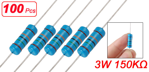 Product Name Metal Film Resistor Rated Power 3W Tolerance ± 1% Resistance Value 150KΩ T.C.R(Temperature Coefficient) ±50ppm/°C Body Size 5 x 16mm/0.2" x 0.61" (D*L) Leads Dia (Approx.) 0.5mm/0.019" Total Length (Approx.) 79mm/3.1" Color As Picture Shown Net Weight 145g Package Content 100 Pcs (± 2%) x Metal Film Resistors - Reviews