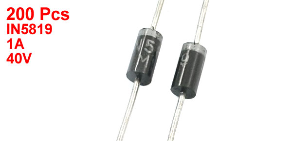 Product Name Schottky Diode Model IN5819 Forward Current 1A Reverse Peak Voltage 40V Lead Size(Each Side) 0.5 x 20mm/0.02" x 0.08"(D*L) Body Size 2.5 x 5mm/0.1" x 0.2"(D*L) Color Black Weight 34g Package Content 200Pcs(±2%) x Schottky Diodes - Reviews