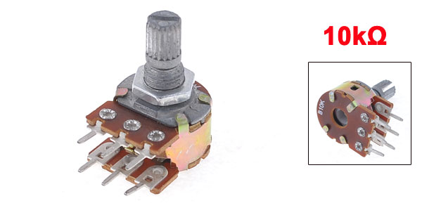 Product Name Potentiometer Type Dual Linear Rotary Shaft Potentiometer Resistance Value 10kΩ Threaded Part Diameter 6mm/ 0.24" Shaft Size 5 x 8mm/ 0.2" x 0.3" (D*L) Size 16 x 25 x 26mm/ 0.6" x 0.98" x 1" (D*W*H) Color Silver Tone Weight 8g Package Content 1 x Potentiometer