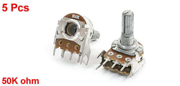 DetailsB50K 50K Ohm 3 Terminals Linear B Type Rotary Knob Taper Potentiometers 5 Pcs  Product Name Potentiometer Model B50K Resistance Value 50K ohm Adjustment Type Top Adjustment Type Single Linear (Type B) Features Knurled Shaft Shaft Diameter 6mm / 0.24" Shaft Length 13mm / 0.51" Mounting Thread Diameter 7mm / 0.28" Base Diameter 17mm / 0.67" Total Size 25 x 18 X 32mm/1" x 0.71" x 1.3"(L*W*H) Material Metal , Electronic Parts Weight 46g Package 5 x Potentiometers