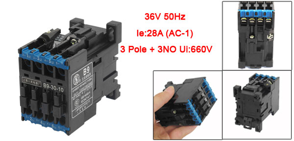 Product Name AC Contactor Model Number B9-30-10 Material Plastic, Metal, Electrical Parts Coil Voltage 36V 50Hz Ui 660V Ue 660V Ith 28A Ie 28A (AC-1) Power 5.5KW(AC-3) Number of Contact 3 Pole + 3NO Terminals Number 4 Screw Terminals Overall Size (Approx.) 8.2 x 7.1 x 4.4cm/3.23" x 2.8" x 1.73 (L*W*T) Mounting Size 35mm Mounting Rail Terminals Color Blue Color Black Net Weight 316g Package Content 1 x AC Contactor - Reviews