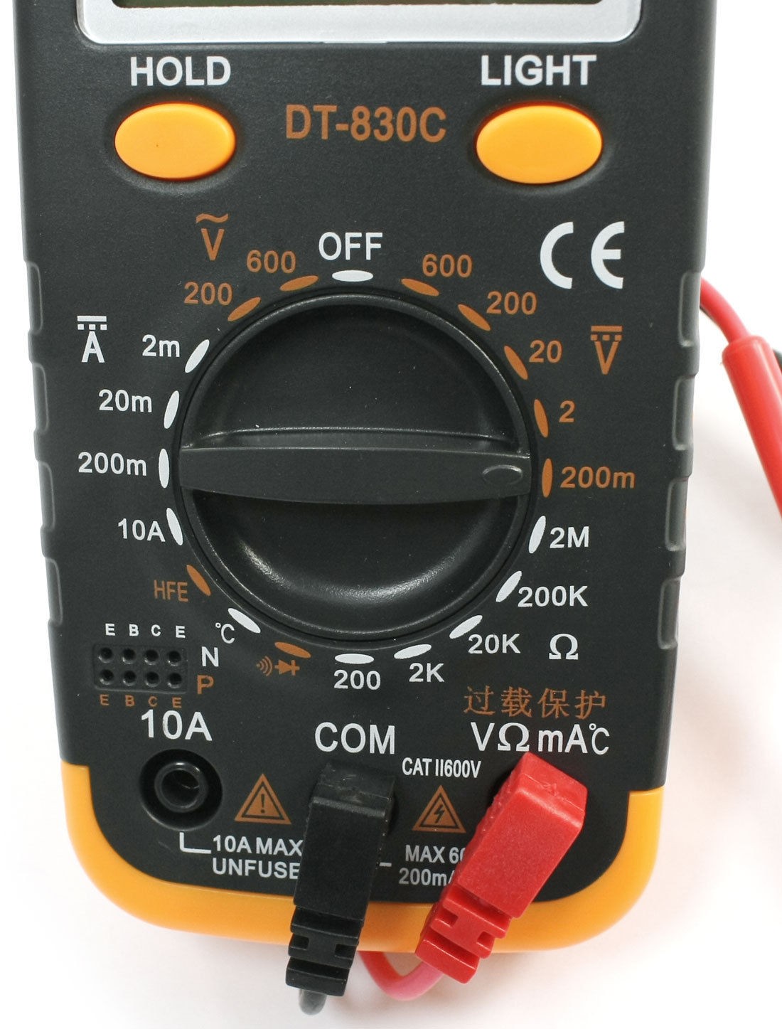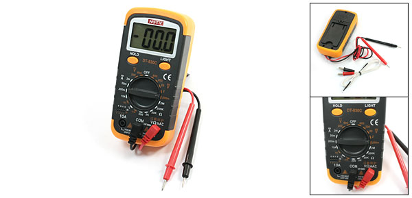 Product Name Digital Multimeter Model DT-830C DC Current 200uA/2mA/20mA/200mA, ±(1.5%+2)10A, ±(3%+2)AC Voltage 200V/600V, ±(1.2%+10) DC Voltage 200mV/2V/20V/200V/600V, ±(0.8%+5) Resistance Rx200/Rx2K/Rx20K/Rx200K/Rx2M, ±(1%+3) Temperature -30°C-400°C, ±(1.2%+4)