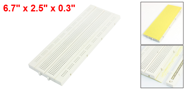 Product Name Solderless Breadboard Model BB-01 Wire Size 20-29 AWG (0.3-0.8mm) Color White Size 170 x 63 x 8mm / 6.7" x 2.5" x 0.3" (L*W*T) Material Plastic, Foam, Electronic Components Connector Aquantity 740 Pcs Net Weight 102g Package Content 1 x Solderless Breadboard - Reviews
