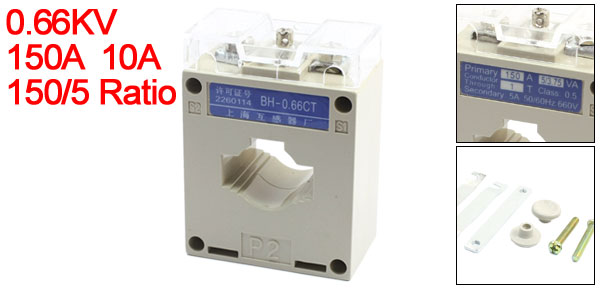 Item Name Current Transformer Model Number BH-0.66CT Rated Current Ratio 150/5 Accuracy Class 0.5 Rated Voltage 0.66KV Working Frenquency 50Hz - 60Hz Conductor Through 1T Primary Current 150A 10VA Secondary Load Capacity 5-3.75VA Opening Size 32 x 25mm/1.2" x 1“(L*W) Total Size 5 x 3.8 x 6cm/2" x 1.5" x 2.4"(L * W * H) Case Material Plastic Color Gray Weight 250g Package Content 1 x Current Transformer