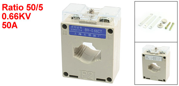 Item Name Current Transformer Model Number BH-0.66CT Rated Current Ratio 50/5 Accuracy Class 0.5 Rated Voltage 0.66KV Working Frenquency 50Hz - 60Hz Conductor Through 1T Primary Current 50A Secondary Load Capacity 5-3.75VA Opening Size 32 x 25mm/1.2" x 1“(L*W) Total Size 5 x 3.8 x 6cm/2" x 1.5" x 2.4"(L * W * H) Case Material Plastic Color Gray Weight 250g Package Content 1 x Current Transformer