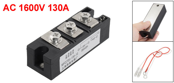 Product Name Rectifier Module Model MFC-130-12 Max. Average Forward Current 130A Max. Working Peak Reverse Voltage AC 1600V Terminals 3 Number of Pins 2 Mount Hole Diameter 6.5mm/ 0.26" Mount Hole Distance 80mm/ 3.15"(Center to Center) Cable Length 25cm/ 9.8" Total Size 95 x 34 x 38mm/ 3.74" x 1.34" x 1.5" (L*W*H) Material Metal, Plastic Color Black, Silver Tone Net Weight 206g Package Content 1 x Rectifier Module - Reviews
