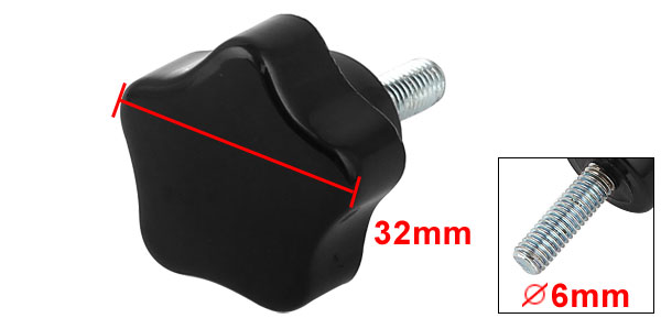 Product Name Star Knob Head Diameter 32mm / 1.3" Threaded Diameter 6mm / 0.24" Thread Length 20mm/ 0.8" Total Height 44mm / 1.7" Material Metal & Plastic Color Black Weight 23g Package Content 1 x Star Knob - Reviews
