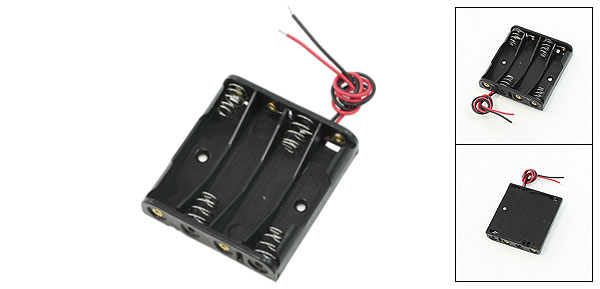 Product Name Battery Case Material Plastic, Metal Body Size 6.2 x 5.7 x 1.5cm / 2.4" x 2.2" x 0.6" (L*W*H) Cable Length( Each ) 14.5cm / 5.7" Battery Type 4 x 1.5V AA Color Black Net Weight 10g Package Content 1 x 1.5V Battery Case Holder - Reviews