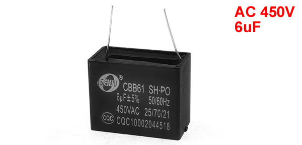 Product Name Air Condition Capacitor Material Polypropylene Film Model CBB61 Rated Capacitance 6uF Rated Frequency 50/60 Hz Rated Voltage AC 450V Overall Size 38 x 31 x 20mm / 1.5" x 1.2" x 0.8" (L*W*T) Pin Size 20 x 0.9mm / 0.8" x 0.035" (L*D) Pin Spacing 29mm / 1.1" Main Color Black Net Weight 23g Package Content 1 x Air Condition Capacitor - Reviews