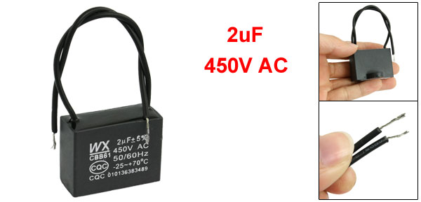 Terminal Wire Ambient Temperature -25~+70°C Rated Capacitance 2uF Tolerance +/-5% Rated Frequency 50/60Hz Rated Voltage 450V AC Size 3.7 x 2.8 x 2.8cm/1.4" x 1.1" x 1.1"(L*W*T) Wire Length 9cm/ 3.5" Install Bore Diameter 0.5cm/ 0.2" Main Color Black Weight 27g Package Content 1 x Motor Run Capacitor - Reviews