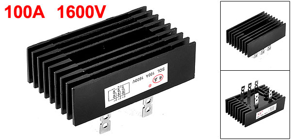 Product Name Bridge Rectifier Model -SQL100A/1600V Output Current(DC) 100A Repetitive Peak Reverse Voltage(AC) 1600V Fixing Holes Diameter 5mm / 0.2" Fixing Holes Spacing 55mm / 2.2" Main Body Size 98 x 59 x 29mm / 3.86" x 2.3" x 1.1" (L*W*T) Overall Height 53mm / 2.1" Material Metal Color Black Net Weight 219g Package Content 1 x Bridge Rectifier - Reviews